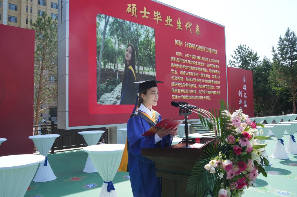 电气与控制工程学院、电气工程及其自动化专业王晨旭同学作为本科毕业生代表和研究生学院计算机应用技术专业何依同学作为硕士毕业生代表先后发言,分别表达了对母校和恩师的感激之情,并立志谨记“厚德博学 强吾兴邦”的校训,牢记母校嘱托,练就过硬本领,勇攀知识高峰,为母校争光、为祖国添彩。