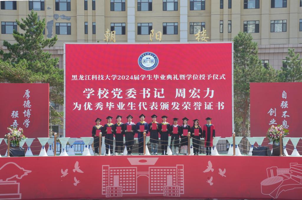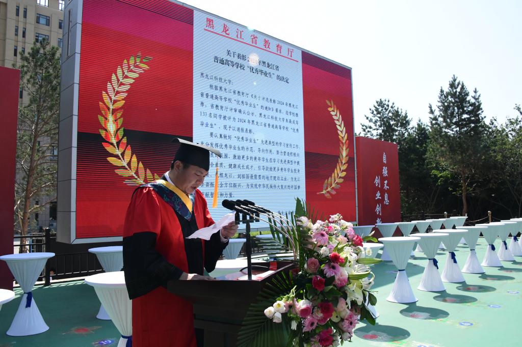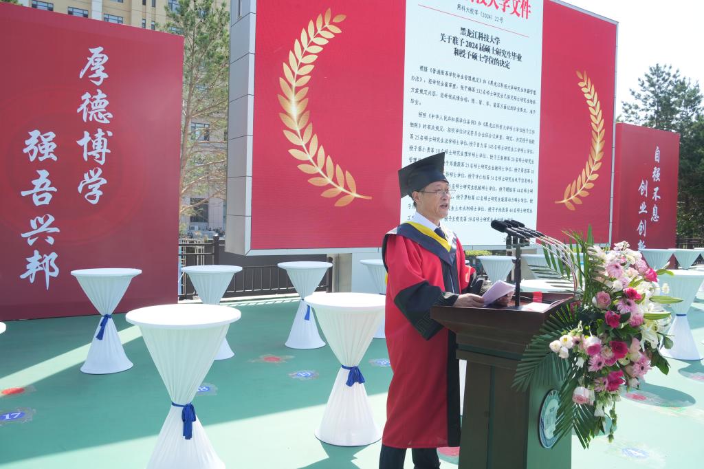 毕业典礼在庄严的国歌声中拉开帷幕,副校长张国华宣读了关于准予2024届硕士、本科学生毕业和授予学位的决定。副校长张保勇宣读了省级“优秀毕业生”的表彰决定。校党委书记周宏力为省优秀毕业生代表颁发荣誉证书。