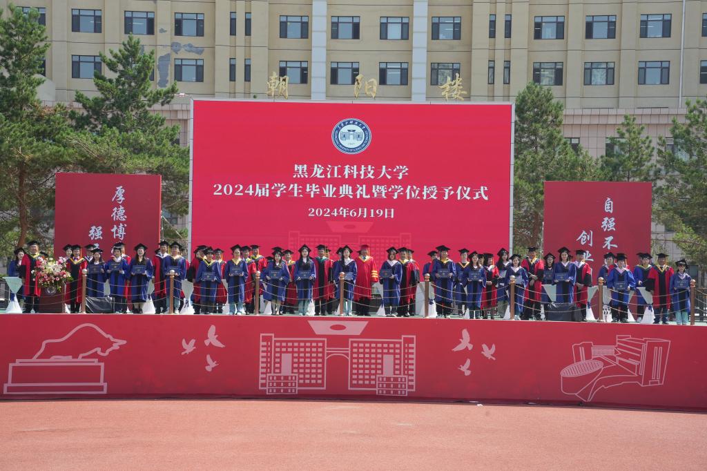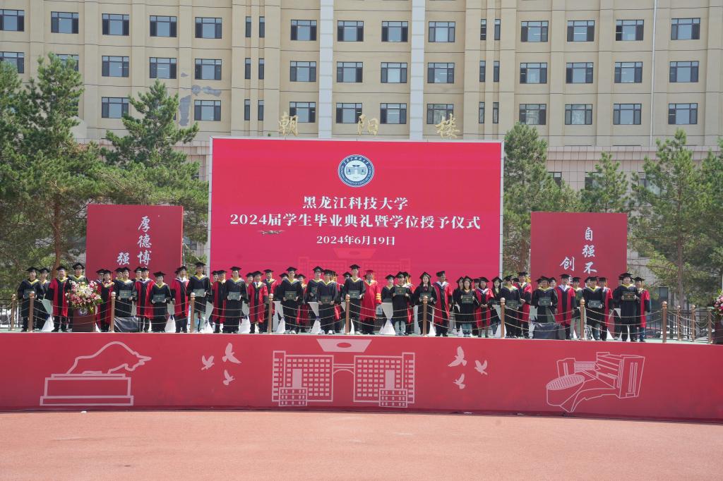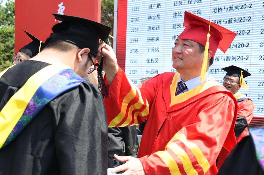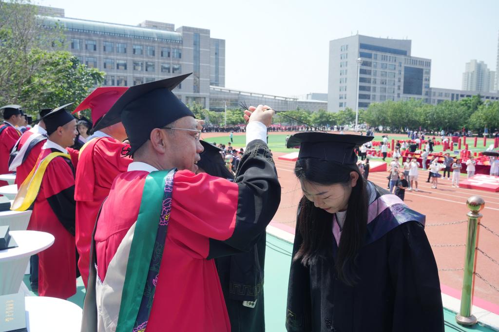 在学位授予仪式上,校领导和校学位委员会委员为2024届硕士、学士毕业生拨穗正冠、颁发学位证书。