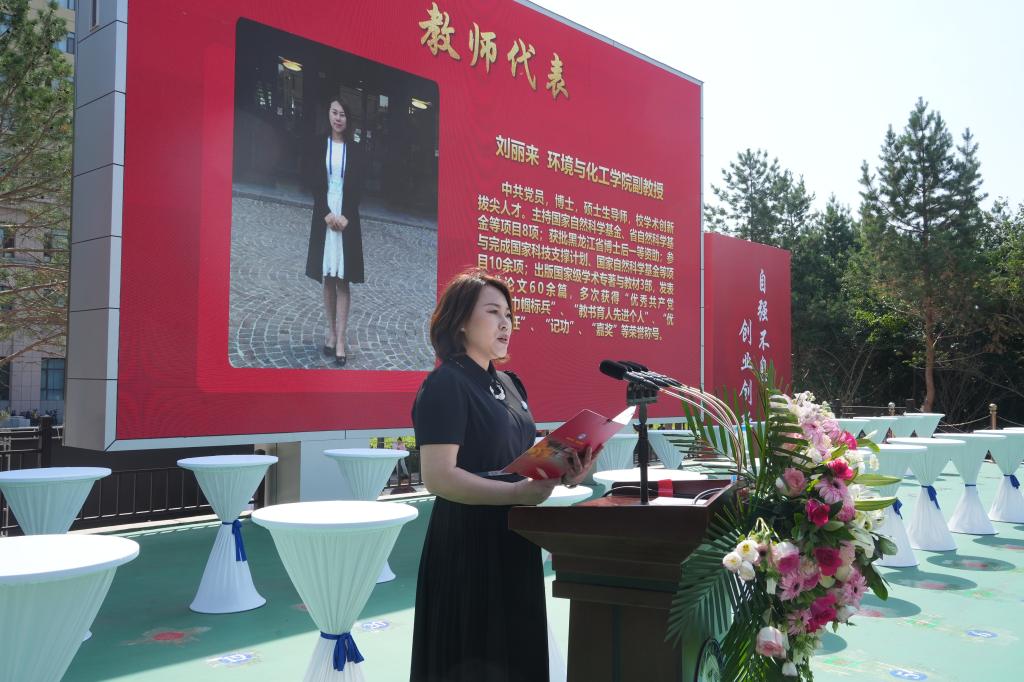 教师代表环境与化工学院教师刘丽来代表全体教师向毕业生表达了衷心的祝福,激励全体毕业生要始终怀揣梦想、向下扎根、热爱生活,在平凡中执着坚守,在热爱中成就人生的辉煌。