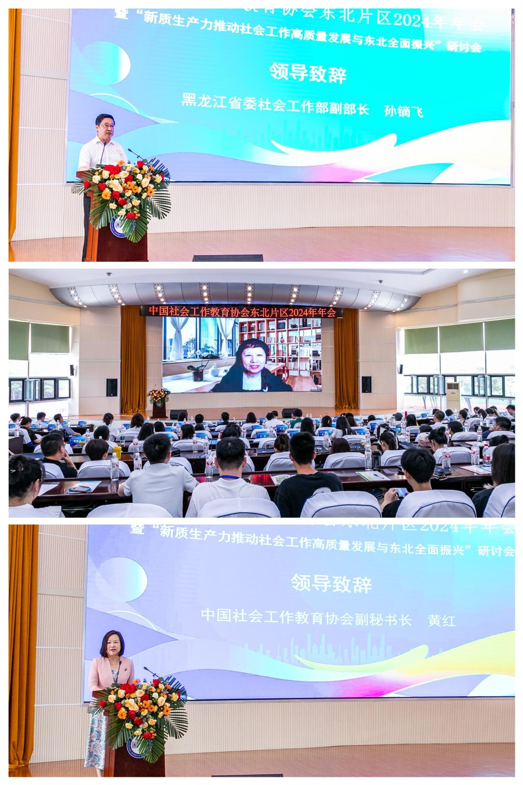 随后,黑龙江省委社会工作部副部长孙镝飞,中国社会工作教育协会会长、北京大学社会学系教授马凤芝,中国社会工作教育协会副秘书长、黑龙江省社会科学院副院长黄红分别致辞,希望以本次年会为契机,通过与会专家学者的共同探索和实践研究,以新质生产力推动社会工作高质量发展,为推动东北全面振兴做出新的更大的贡献。