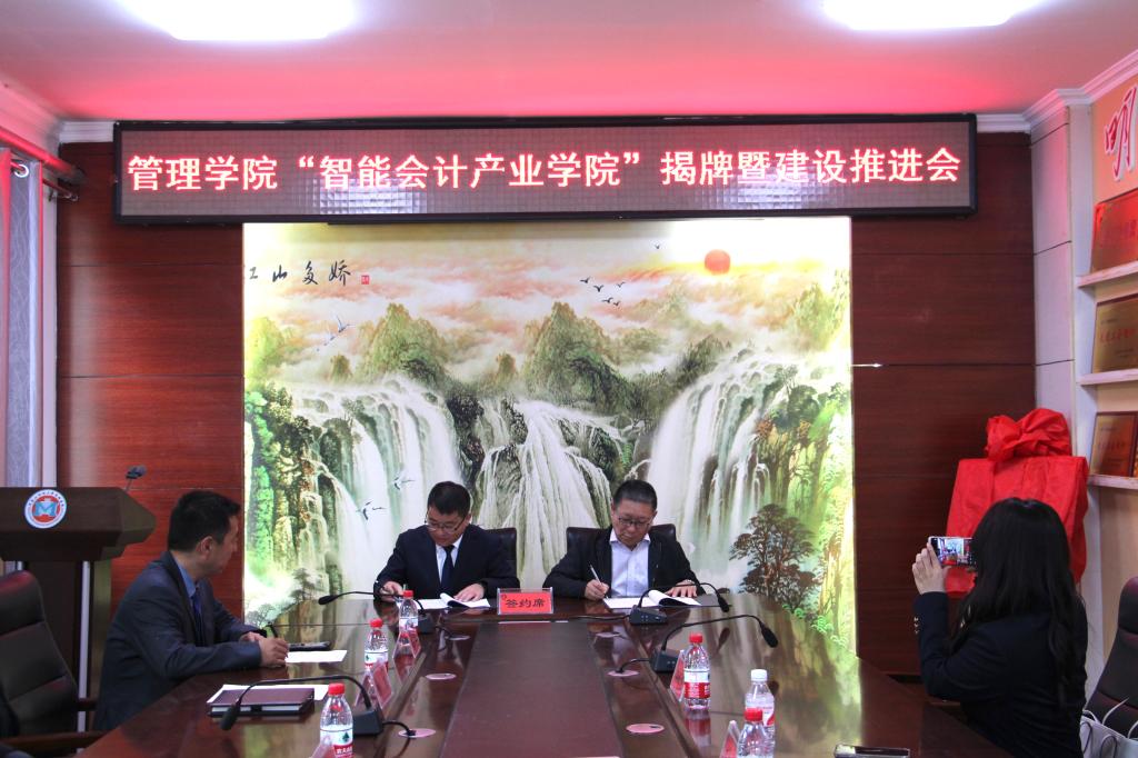 会上,管理学院院长洪亮与金蝶精一执行副总裁乐志军代表校企双方签署了《幻影手机官方网站_幻影(中国)管理学院金蝶精一信息科技服务有限公司校企合作框架协议书》,并举行了“智能会计产业学院”的揭牌仪式。