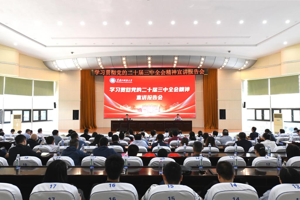 学校党委副书记桑玉军在主持报告会时强调,全校各单位和宣讲团成员要以高度的政治自觉迅速行动起来,积极全面开展好党的二十届三中全会精神宣讲工作。一要加强组织领导,深刻认识党的二十届三中全会精神宣讲的重要意义,切实提高政治站位,强化政治担当,把党的二十届三中全会精神宣讲工作作为一项重大政治任务,认真贯彻落实工作安排,精心组织、周密部署、协调推进,确保全会精神宣讲工作扎实有序开展、取得良好成效。二要注重融会贯通,注重宣讲党的二十届三中全会精神的丰富内涵和核心要义,把宣讲全会精神同学习领会习近平总书记关于教育的重要论述、全国教育大会精神、对东北地区和我省历次重要讲话重要指示精神贯通起来,紧密结合省委十三届六次全会精神,统筹把握蕴含其中的理论逻辑、历史逻辑、实践逻辑,对重要目标任务、改革措施一体推进落实,推动党的二十届三中全会精神在学校落地生根、见行见效。三要注重知行合一,强化党的二十届三中全会精神宣讲的实效性,把全会精神学习宣传贯彻工作同解决教育教学改革发展稳定的重大问题、师生员工关注的突出问题、纵深推进全面从严治党的紧迫问题结合起来,坚持把全会精神融入育人全过程、融入办学治校全过程,进一步筑牢为党育人、为国育才初心使命,切实把学习贯彻党的二十届三中全会精神转化为干事创业的强大精神动力,以钉钉子精神抓好学校各项改革任务,为学校全面深化教育综合改革奠定扎实的理论和思想基础。