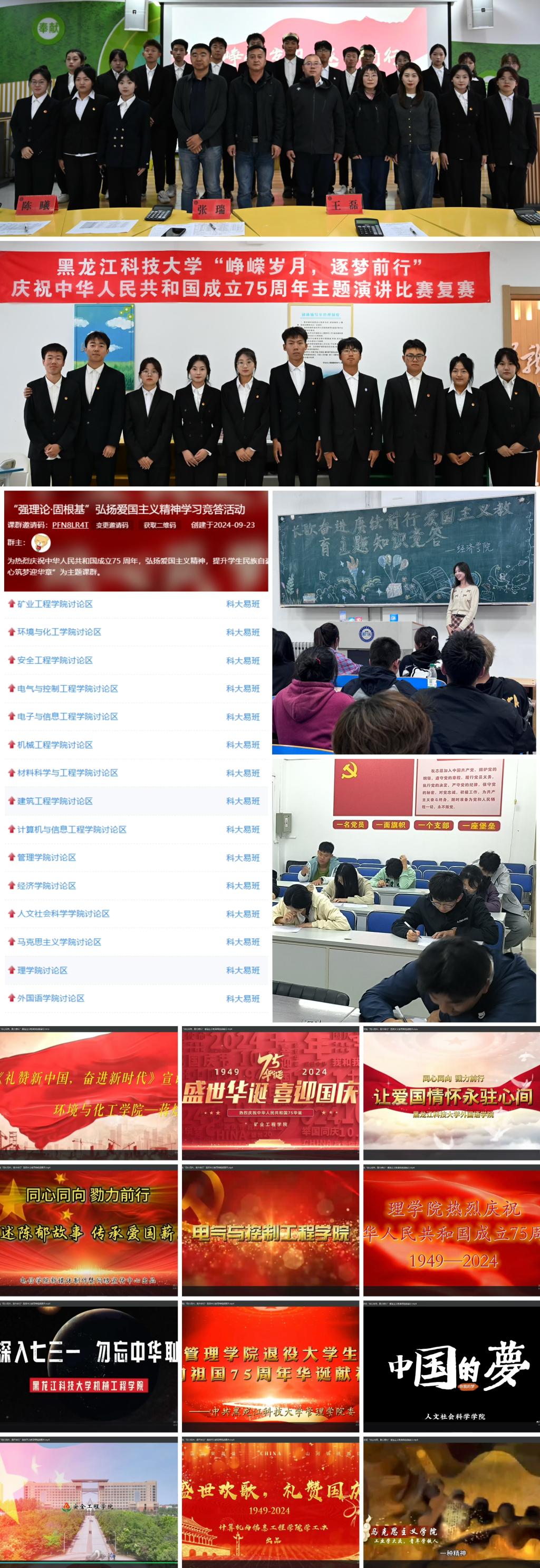 为进一步弘扬爱国主义精神,全校各班级召开“长歌奋进,赓续前行”爱国主义教育主题班会。矿业学院、环化学院、电气学院、电信学院、机械学院、材料学院、建工学院深化中国特色社会主义和中国梦宣传教育,引导学生把实现个人理想融入实现国家富强、民族振兴、人民幸福的伟大梦想之中,把爱国之情转化为报国之行。计算机学院、管理学院、经济学院、人文学院、马克思学院、理学院、外国语学院以“中华民族伟大复兴”为切入点,深入开展理想信念教育,引导学生坚持中国道路、弘扬中国精神、凝聚中国力量,为实现中华民族伟大复兴的中国梦提供强大精神动力。
