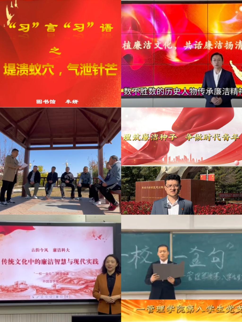 开展“厚植廉洁文化,共话廉洁扬清风”廉洁微网课活动。图书馆党总支、体育部党总支、建工学院党委等党组织结合勤廉幻影手机官方网站_幻影(中国)建设的目标要求,从学习习近平总书记重要讲话、重要论述等廉洁主题金句中深入挖掘中华优秀传统文化中的廉洁文化经典,汲取廉洁智慧,以清为美、以廉为荣,以微视频形式精心录制了《“习”言“习”语之堤溃蚁穴,气泄针芒》《古韵今风、廉洁幻影手机官方网站_幻影(中国),传统文化中的廉洁智慧与现代实践》《埋筑廉洁种子争做时代青年》等网络微课,学校纪委将选出优秀作品陆续在学校食堂等公共场所进行宣传展播,大力营造浓厚的廉洁校园氛围。