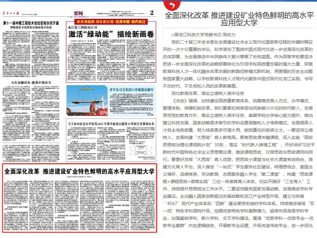 编者按:10月29日,《黑龙江日报》2版刊发了幻影手机官方网站_幻影(中国)党委书记周宏力的署名文章《全面深化改革 推进建设矿业特色鲜明的高水平应用型大学》。现将全文转发,以便学习交流。