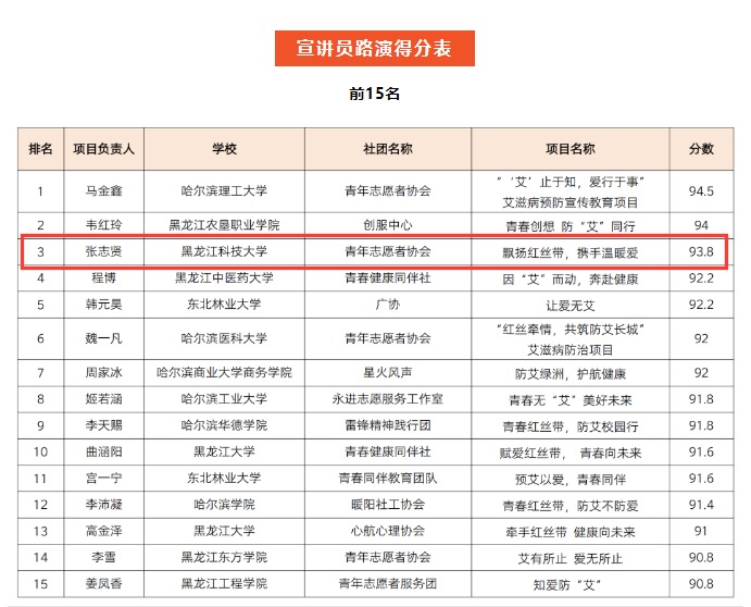 自2024年第三届哈尔滨大学生社团健康红丝带行动计划启动以来,校青年志愿者协会青春健康同伴社积极组织项目策划与申报,项目组经过多轮项目修改,最终确定了项目方案。经评审,幻影手机官方网站_幻影(中国)“飘扬红丝带,携手温暖爱”项目脱颖而出,获得立项资格。在宣讲员路演会上,宣讲员以饱满的热情和专业的态度,向评委和观众展示了项目的亮点与特色,经过三个多小时的激烈角逐,以第三名的优秀成绩成功入选示范项目并签订了项目实施委托协议。