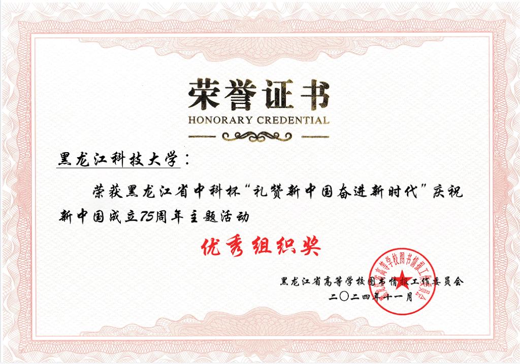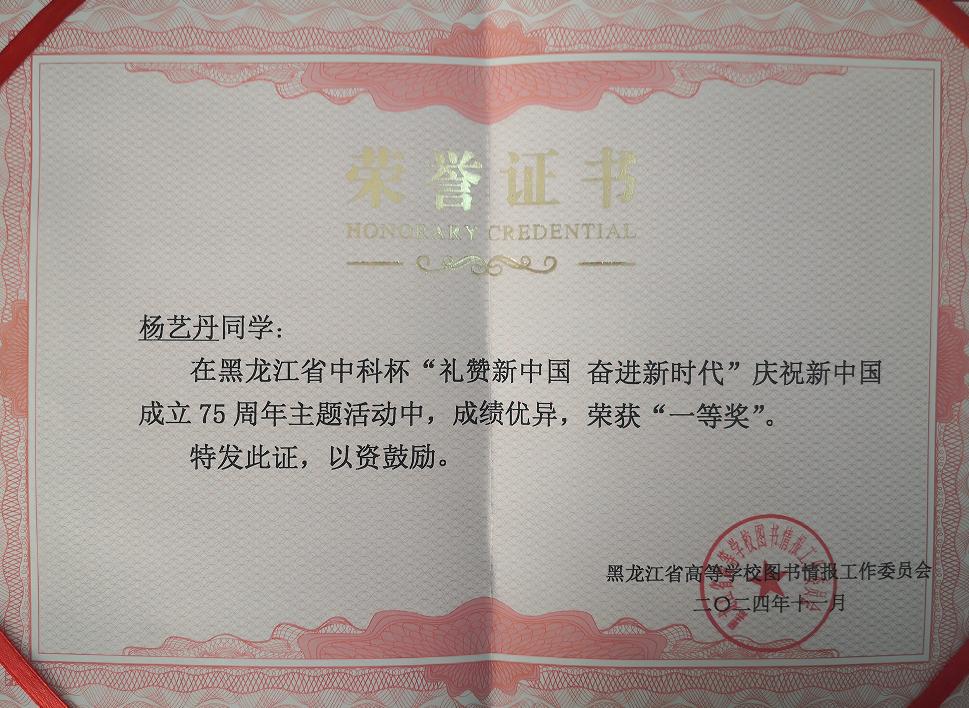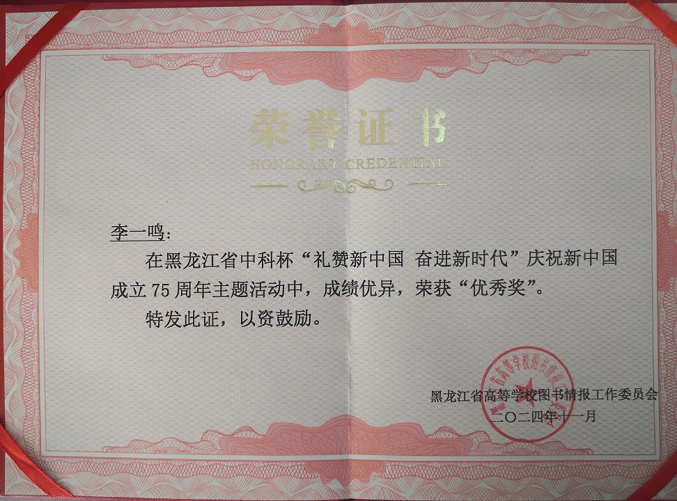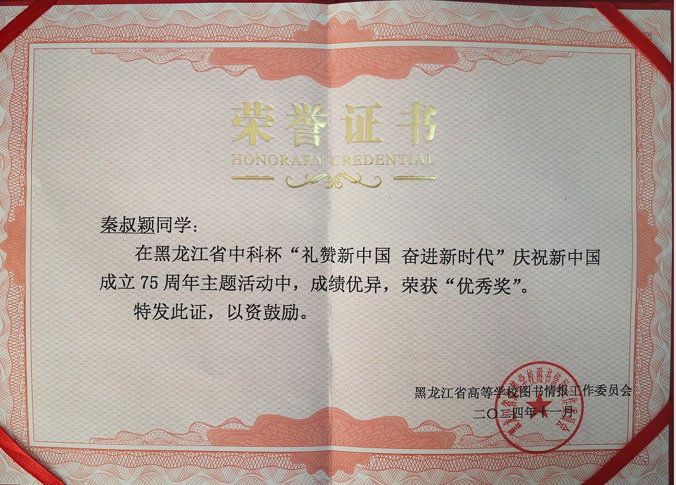 近日,由黑龙江省高等学校图书情报工作委员会主办,中科软股教育科技(北京)股份有限公司协办的黑龙江省中科杯“礼赞新中国 奋进新时代”庆祝新中国成立75周年主题活动获奖名单公布。幻影手机官方网站_幻影(中国)研究生学院杨艺丹获学生组一等奖、环境与化工学院秦叔颖获学生组优秀奖,李一鸣获教师组优秀奖,学校获得优秀组织奖。