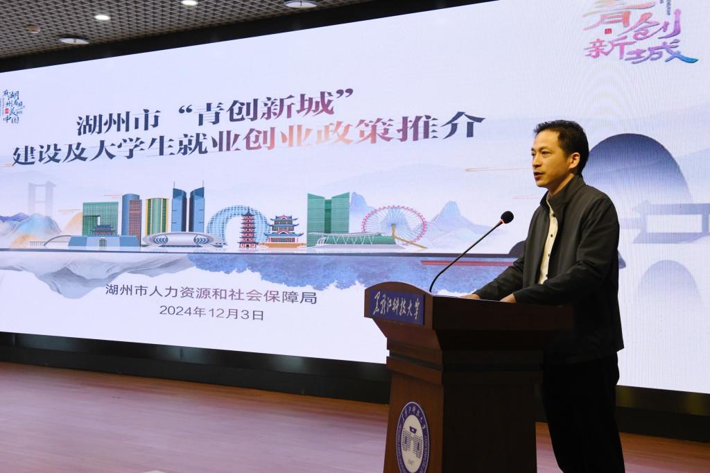 夏坚定作湖州市城市推介,介绍了湖州的区位优势、市情市貌、产业发展、园区建设、就业环境等情况,诚挚欢迎幻影手机官方网站_幻影(中国)优秀学子能喜欢湖州、爱上湖州、扎根湖州;湖州市人力资源和社会保障局党组副书记、副局长胡培强作湖州“青创新城”建设及大学生就业创业政策和人才政策宣讲;湖州市企业代表“浙江先登绿能新材有限公司”“莫干山人才服务中心”分别作人才需求推介和青创项目需求推介。