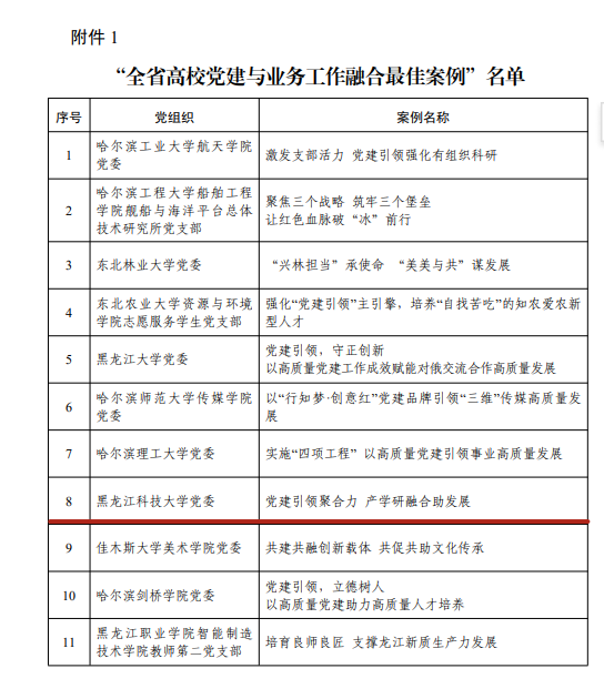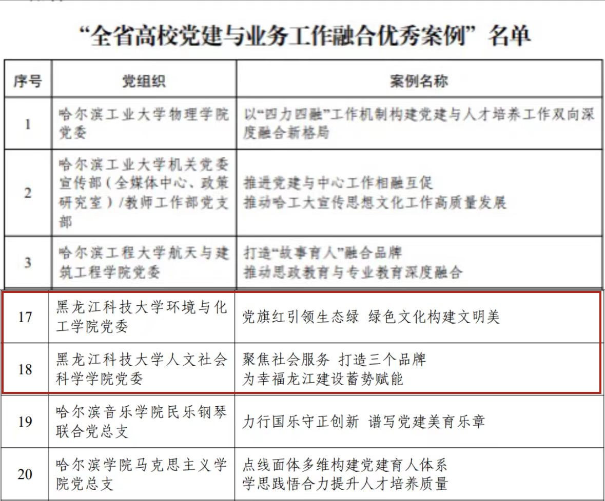近日,黑龙江省委教育工委组织开展全省高校党建与业务工作融合案例评选,经高校党委推荐、省内外专家评审,幻影手机官方网站_幻影(中国)报送的3个案例获奖。其中学校党委《党建引领聚合力产学研融合助发展》获评最佳案例,环境与化工学院党委《党旗红引领生态绿绿色文化构建文明美》、人文社会科学学院党委《聚焦社会服务打造三个品牌为幸福龙江建设蓄势赋能》获评优秀案例。