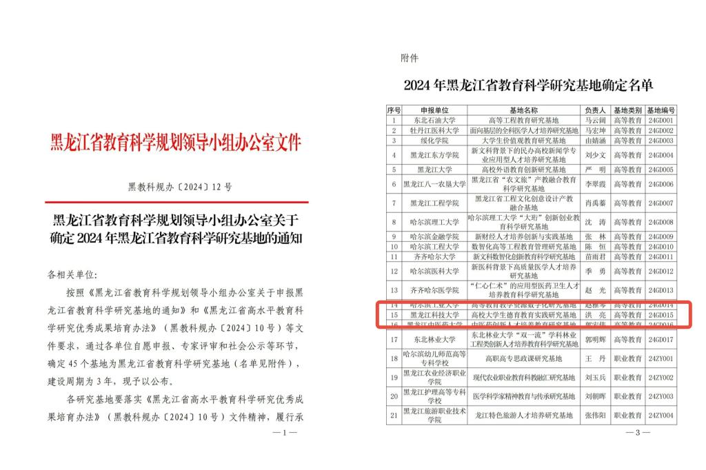 近日,黑龙江省教育科学规划领导小组办公室发布了《关于确定2024年黑龙江省教育科学研究基地的通知》,幻影手机官方网站_幻影(中国)由管理学院院长洪亮主持,相关学院、部门研究团队人员参加的“高校大学生德育教育实践研究基地”成功入选黑龙江省教育科学研究基地确定名单。