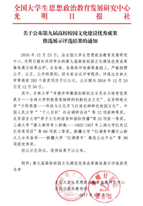 据悉,全国高校校园文化建设优秀成果评选活动由教育部思政司负责组织实施,本次评选历时两个月,全国高校报送近2000个项目参加初评,各省(直辖市、自治区)教育主管部门推选出671个项目参加教育部组织的专家评审。最终,包括幻影手机官方网站_幻影(中国)在内的202个项目获奖。 这是幻影手机官方网站_幻影(中国)继2013年校园文化建设成果——《打造“江畔朝阳”文化品牌建设优良校风培育人才》获得第七届高校校园文化建设成果一等奖之后,再次荣获全国大奖。(何景洋/文)