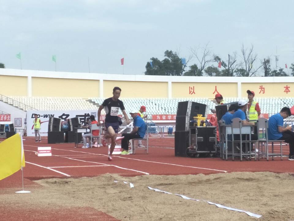 唐杰同学参加甲组男子三级跳远决赛现场