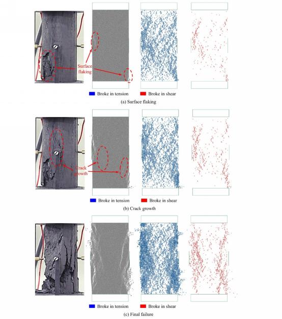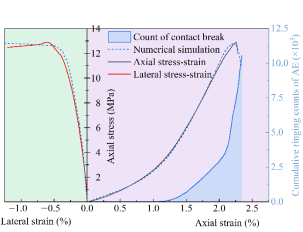 通过上述研究,一方面验证了含连结物质裂纹接触模型能有效模拟岩石的完整力学性质,另一方面为需要考虑岩石低应力状态下变形特征的工程模拟提供了理论模型和参考案例。同时,团队提出,岩石微裂纹的数值模拟研究应集中在三个方向:裂纹面的形态还原、裂纹变形和破坏的精细化模拟、细观力学机制和数值模拟计算方法的结合。