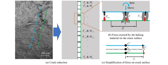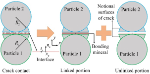 研究团队系统梳理了岩石中微裂纹力学作用机制的研究资料,对比分析了煤、岩微裂纹的扫描电镜影像,发现了连结物质在岩石微裂纹中普遍存在的特征。文章结合连结物质分布特征,重点分析并推导了岩石微裂纹中连结物质对裂纹面作用力的等效计算方法,并提出了一种新的接触模型:通过将随机分布的连结物质等效为连结面、将裂纹面等效为等宽概念面的方式,获得了考虑裂纹中连结物质的裂纹接触模型。