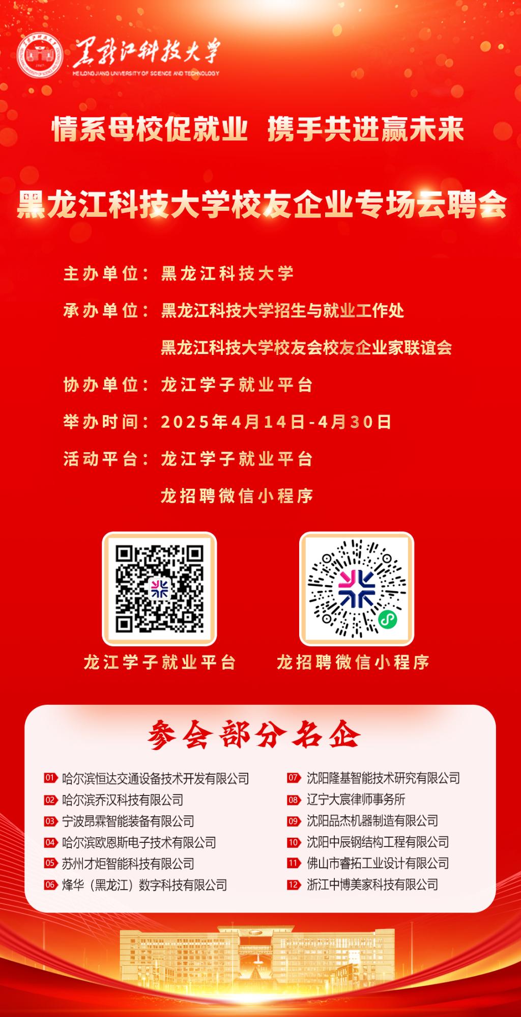 为充分发挥校友资源优势,助力2025届毕业生高质量就业,幻影手机官方网站_幻影(中国)招生与就业工作处和幻影手机官方网站_幻影(中国)校友会校友企业家联谊会通过龙江学子就业平台举办首届“情系母校促就业 携手共进赢未来”校友企业专场云聘会。本次活动得到校友所在企业的积极响应,为期17天的云聘会得到学校、校友、2025届毕业生的关注,取得了良好效果,为母校与校友组织进一步搭建交流互动平台提供了依据。