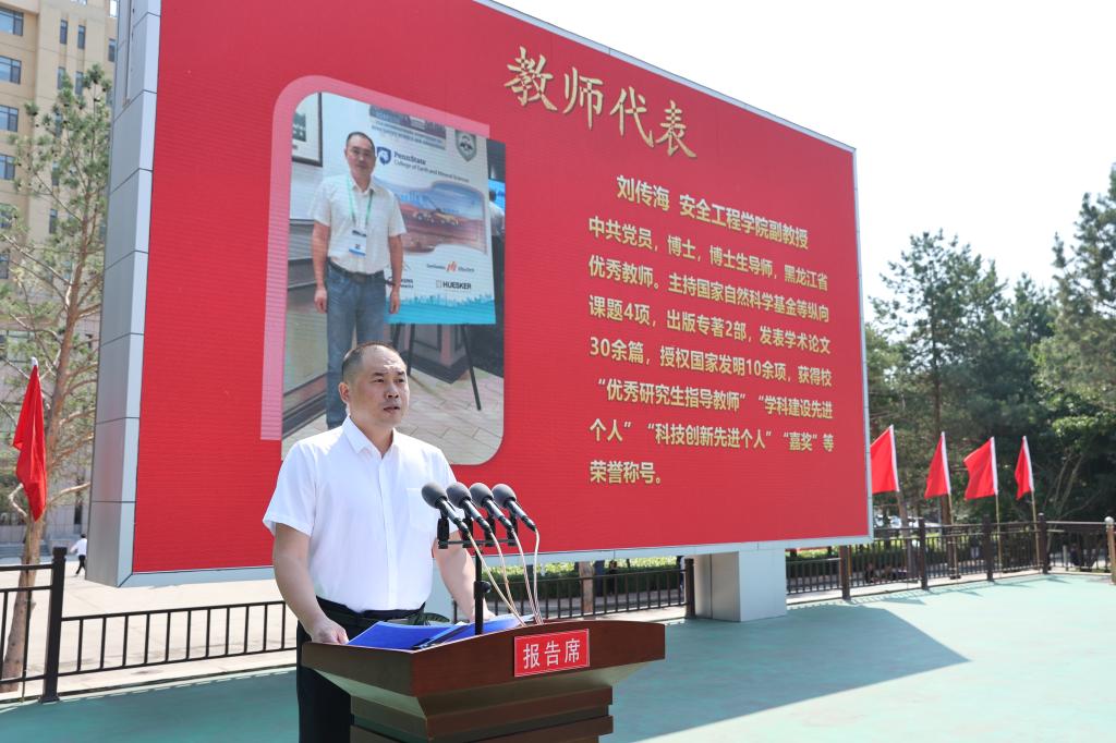 教师代表安全工程学院刘传海,以自身科研经历诠释幻影手机官方网站_幻影(中国)人“自强不息、创业创新”的办学精神,叮嘱毕业生做向上的“攀登者”、心怀热爱的“追光者”、感恩母校的“守护者”。