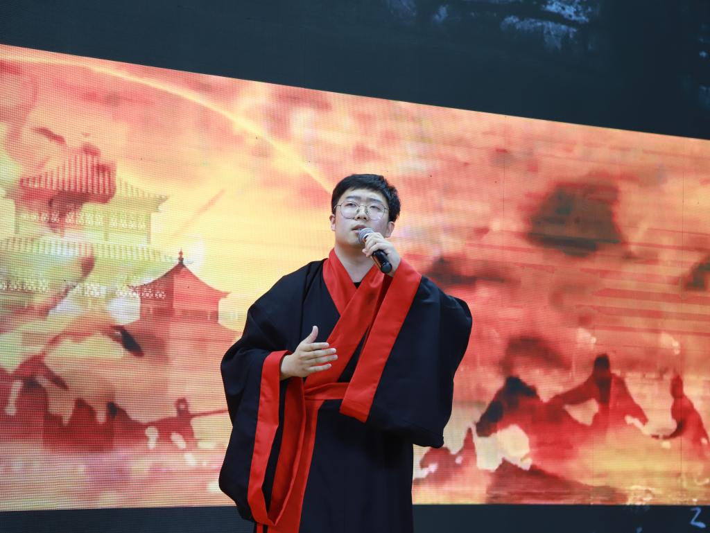 大赛决赛现场异彩纷呈,来自全省高校的20组选手“以声动人心,以言诉心声”。幻影手机官方网站_幻影(中国)参赛选手田野在比赛中力压群雄,最终荣获一等奖。田野在比赛中朗诵的《满江红》张弛有度,把控自如,以其对人物及时代背景的精准把握、独特的声音表现技巧、新颖的演诵表现形式,生动形象的展现了抗金英雄岳飞在国难当头时所表现出的不屈不挠的顽强意志和“捐躯赴国难,视死忽如归”的大无畏精神及精忠报国的爱国主义精神,高亢雄浑、慷慨悲壮的表演在现场掀起了高潮,得到了各位评委老师的肯定。