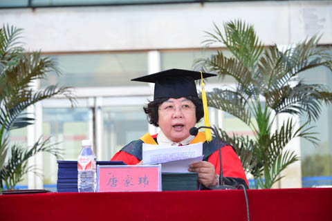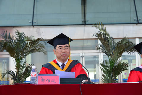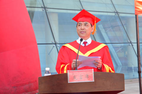 校长武俊峰代表学校致辞。武校长和毕业生们一起深情回顾了大学时光,分享了他们在学校度过的难忘瞬间和点点滴滴,并在同学们即将离开母校之际,作为母校的校长和同学们的朋友,向全体毕业生送上了祝福。一是希望同学们在这个理想与梦想交织的时代,需要义不容辞的担当!他强调,在我国全面深化改革开放时代,需要同学们坚定的理想信念,要让社会主义核心价值观成为自己的人生遵循,让“厚德博学,强吾兴邦”成为自己的人生准则,坚守中国特色社会主义道路、坚守民族精神、坚定个人理想,以强烈的爱国情怀、昂然的浩然正气、宽广的胸怀视野、锐意进取的拼搏精神,勇做走在时代前列的奋进者、开拓者、奉献者。二是希望同学们在这个开放的时代,需要纵横四海的胆魄!他指出,同学们理应拿出富强祖国、面向世界的胆略,把握国家开放的脉搏,迈向更加广阔的天地。还需要植根于内心的修养、无需提醒的自觉、以约束为前提的自由、为他人着想的善良。三是希望同学们在这个奋进的时代,需要创业创新的精神!他强调,同学们要在实现中国梦的生动实践中放飞青春梦想,在为人民利益的不懈奋斗中书写人生华章,在“自强不息、创业创新”办学精神感召下鼓舞人生斗志。要牢记习近平总书记“空谈误国、实干兴邦”的嘱托,埋头苦干,从点滴做起,用勤劳的双手、一流的业绩成就属于自己的、母校的、祖国的人生辉煌!