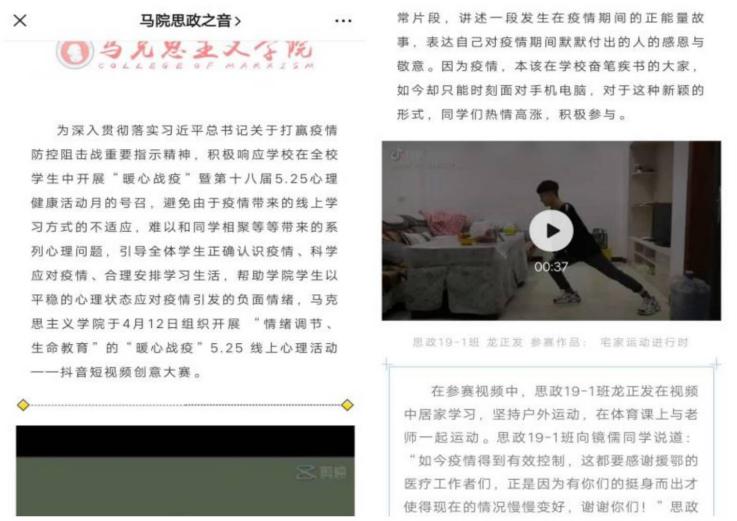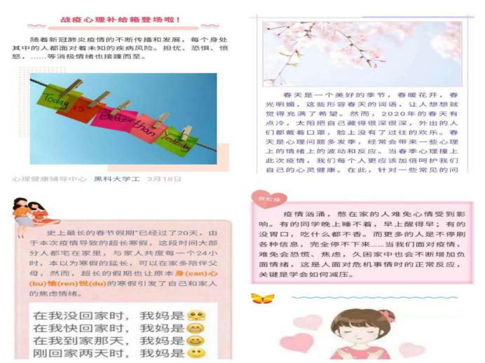 结合学生居家生活状态,心理中心和各学院充分利用网站、官方微信“黑幻影手机官方网站_幻影(中国)学工”、各学院公众平台等新媒体端,为广大师生提供疫情期间的心理科普知识、心理问题应对、身心放松操、心理图书分享、心理影片分享等维持正常生活、学会自我心理调节、寻求社会支持和心理干预等方面的技巧和方法,促进了学生稳定良好心态的保持。