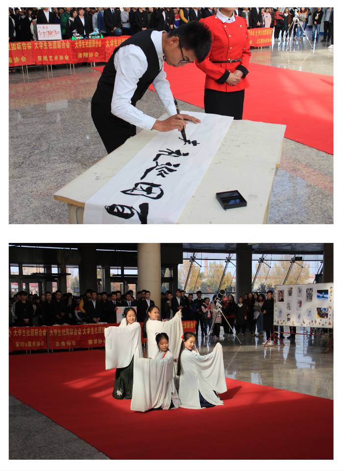 启动仪式上,华夏重光汉服社带来了古色古香的《橘颂》舞蹈表演,书画协会王天印同学创作了书法作品“百团献礼奏华章”,生动优美的舞蹈辅以书法的墨韵,淋漓尽致的为在场的每一位嘉宾和同学诠释了社团的青春风采。除此之外,社团各协会也都结合自身特色元素巧妙地融入到展示中,吸引了众多同学参与其中。启动仪式结束后,现场嘉宾和同学共同参观了第四届金秋书画展。