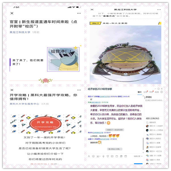 为了方便新生和家长提前了解学校情况,学校利用网络和新媒体提前推送详细全面的报到攻略和校园VR全景信息。学工部官方微信推送系列迎新博文10余篇,营造良好的线上迎新氛围。各学院也借助新媒体平台和成立新生微信群和QQ群,在新生入校前与新生积极互动,为新生来校提供咨询与服务,前置开展新生入学教育。