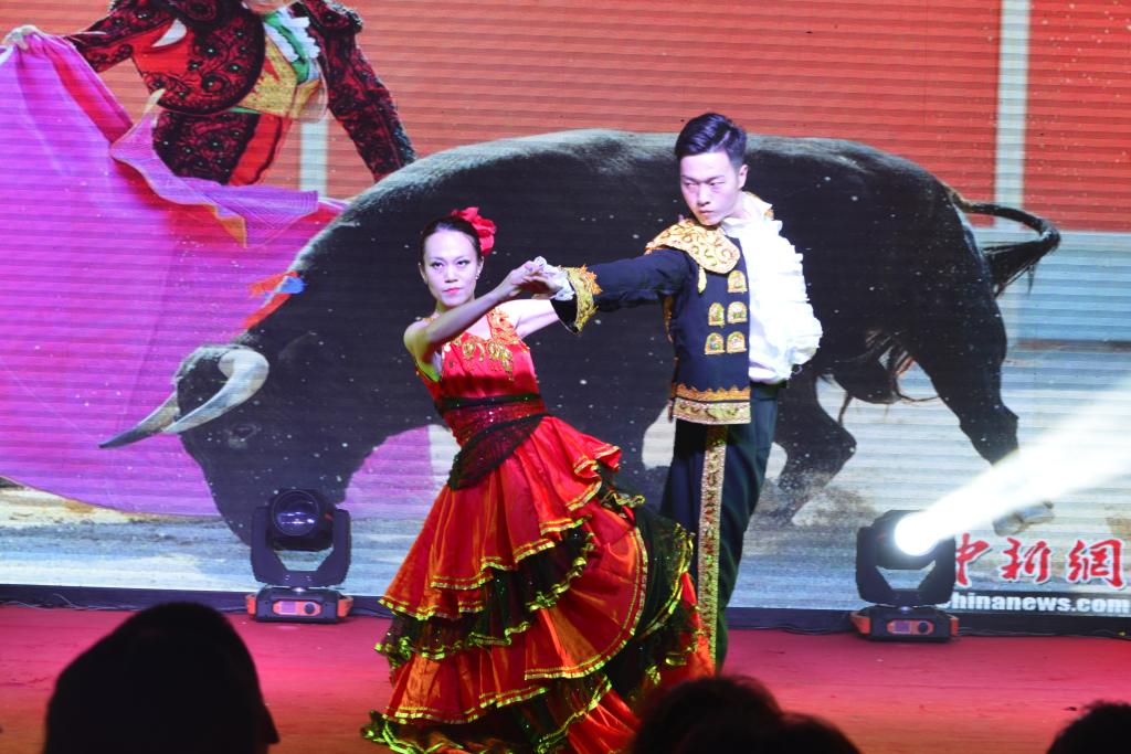 舞蹈《斗牛舞》,男舞刚劲有力,女舞英姿飒爽,展现了对勇敢者的崇拜及对爱情和幸福生活的追求。