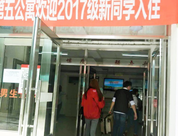 每个公寓宿舍也开始了迎新工作。各个宿舍楼门口都安置了接待处。