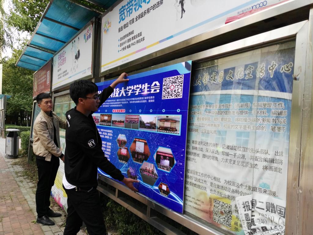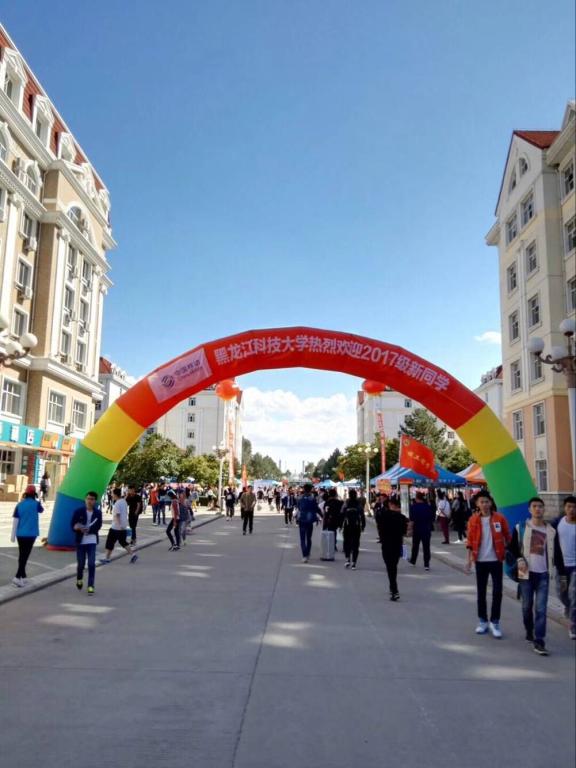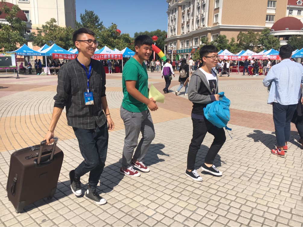 31日清晨,文化广场开始搭建彩虹门,各学院在文化广场搭起了迎新服务台。