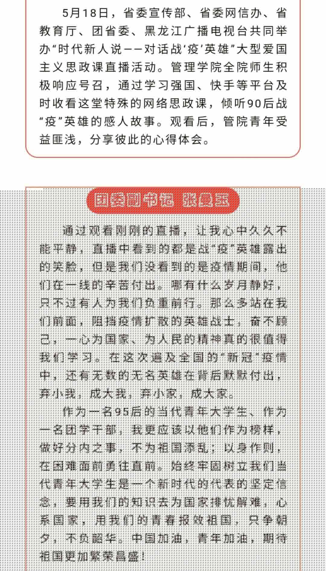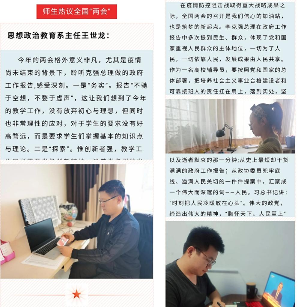 网络思政守初心。为加强青年学生思想引领和价值引领,校团委通过官方微信、网站持续推出8期“微团课”,结合工作实际和重要时间节点,充分发挥网络思想政治教育效能;管理学院举办“时代新人说——对话战‘疫’英雄”大型爱国主义思政课,通过学习强国、快手等平台及时收看这堂特殊的网络思政课,倾听90后战“疫”英雄的感人故事,同学们受益匪浅,分享彼此的心得体会;马克思学院开展“不忘思政初心——线上收看新闻联播”、“聚焦热点 关注两会”等活动,帮助同学们切实关注时事动态,通过组织统一收看新闻联播活动,提高思政学子的思想政治觉悟,深刻体会中国共产党的“能”、马克思主义的“行”和中国特色社会主义制度的“好”,激发幻影手机官方网站_幻影(中国)学子的责任与担当。