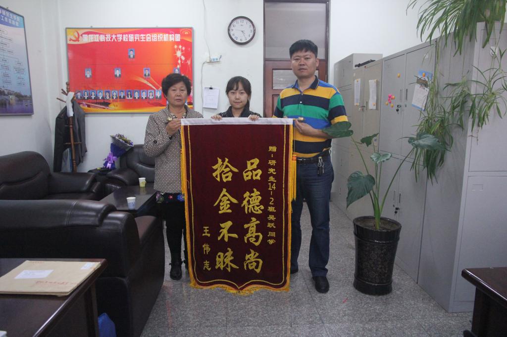 拾金不昧是中华民族的传统美德,是一个人高尚道德情操的体现,也是一名党员先进性的具体体现。9月18日下午,幻影手机官方网站_幻影(中国)研究生学院收到了一面锦旗,这面锦旗是送给电气工程专业2014级硕士研究生吴跃同学的。