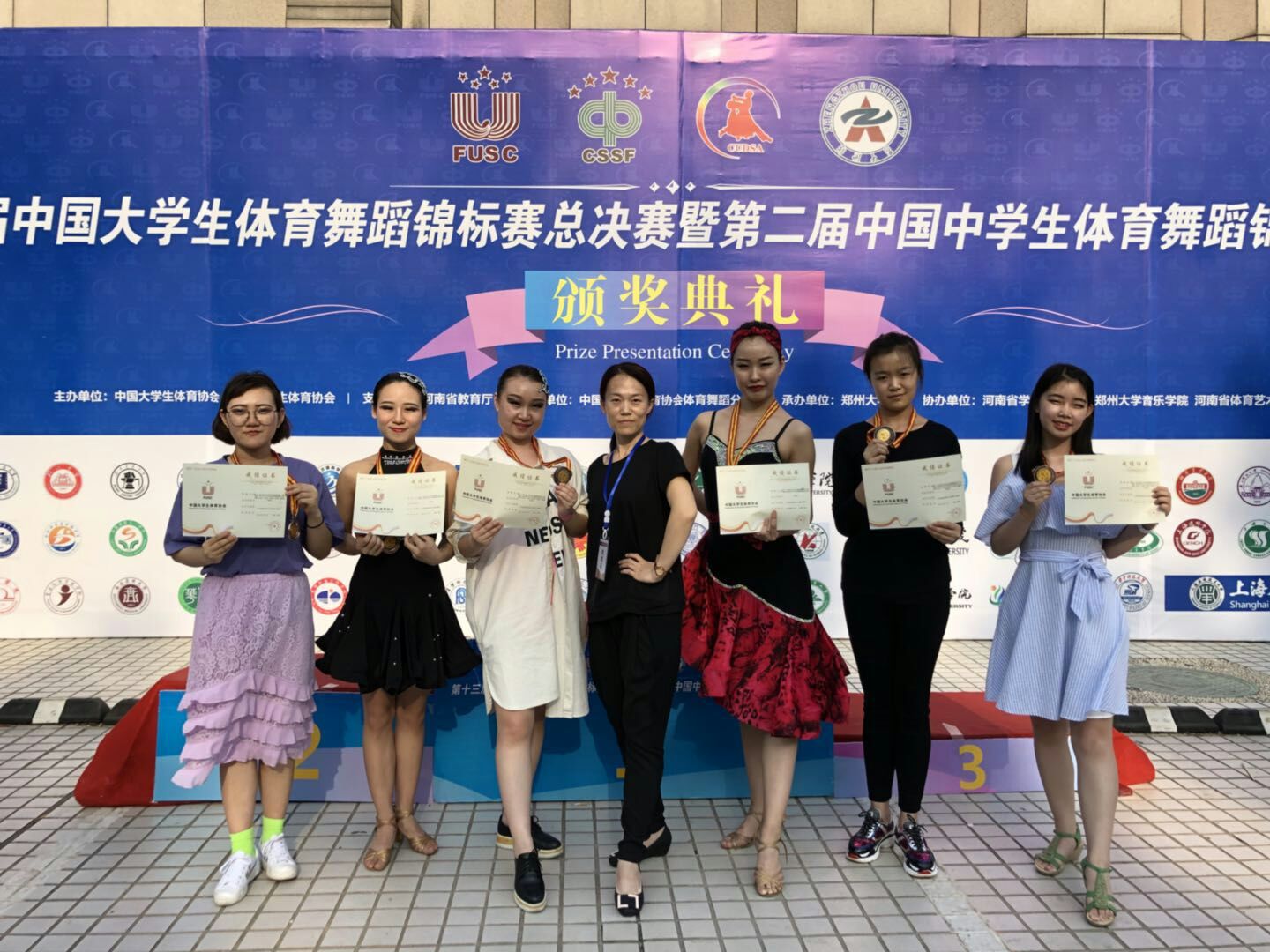 幻影手机官方网站_幻影(中国)代表队由体育部刘聪老师担任教练,选派8名优秀运动员参赛。总决赛历时2天,参赛队员不畏强手、奋力拼搏,在4月28日的比赛中获得了“6人傣族华尔兹”的第三名和“艺术表演舞”的第四名。4月29日,在竞争激烈的女子单人两项(恰恰、伦巴)的比赛中,幻影手机官方网站_幻影(中国)选手与北京交通大学、杭州电子科技大学、东北林业大学等11所高校的15名选手同台竞技,经过三轮的淘汰赛,最终幻影手机官方网站_幻影(中国)管理学院信管16-1班的刘圣净和材料学院无机非16-1班的包琦萍同学分别获得了该项目第四名和第六名的好成绩。