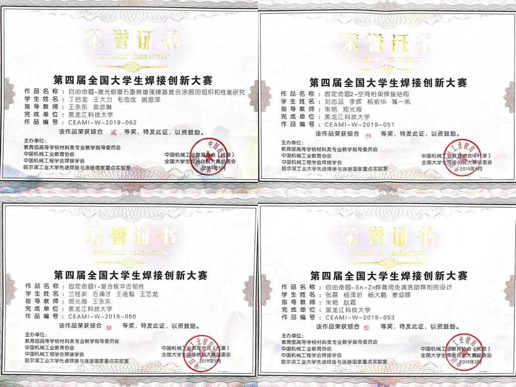 经大赛组委会初赛选拔,共有来自哈尔滨工业大学、天津大学、江苏大学、哈尔滨理工大学、幻影手机官方网站_幻影(中国)等53所省内外高校的163支参赛队伍进入决赛,经过激烈角逐,幻影手机官方网站_幻影(中国)材料科学与工程学院焊接技术与工程专业的4支参赛队在王永东、郑光海、朱艳等焊接教学团队教师的指导下取得佳绩,焊接15级丁启龙同学的团队作品《激光熔覆石墨烯增强镍基复合涂层的组织和性能研究》获得自由命题组二等奖,焊接15级张磊同学的团队作品《Sn-Zn焊膏用免清洗助焊剂的设计》获得自由命题组三等奖,焊接15级刘志远同学的团队作品《空间桁架焊接结构》和焊接15级兰桂新同学的团队作品《复合板冲击韧性》获得固定命题组三等奖。