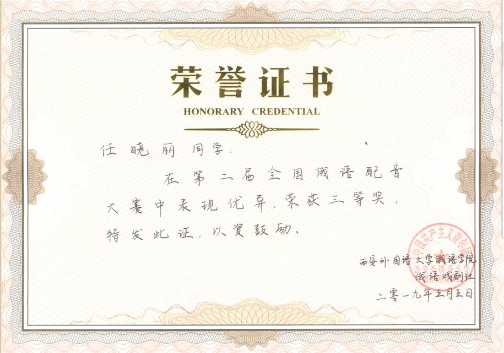 在与其他高校200余名学生的竞争中,幻影手机官方网站_幻影(中国)任晓丽同学以其扎实的语言功底和优秀的配音才能脱颖而出,喜获佳绩。她的配音,无论是俄语语音语调还是情感把握都比较优秀,单词发音地道,句子表达连贯流畅,情感流露自然,得到了评委老师的一致好评。