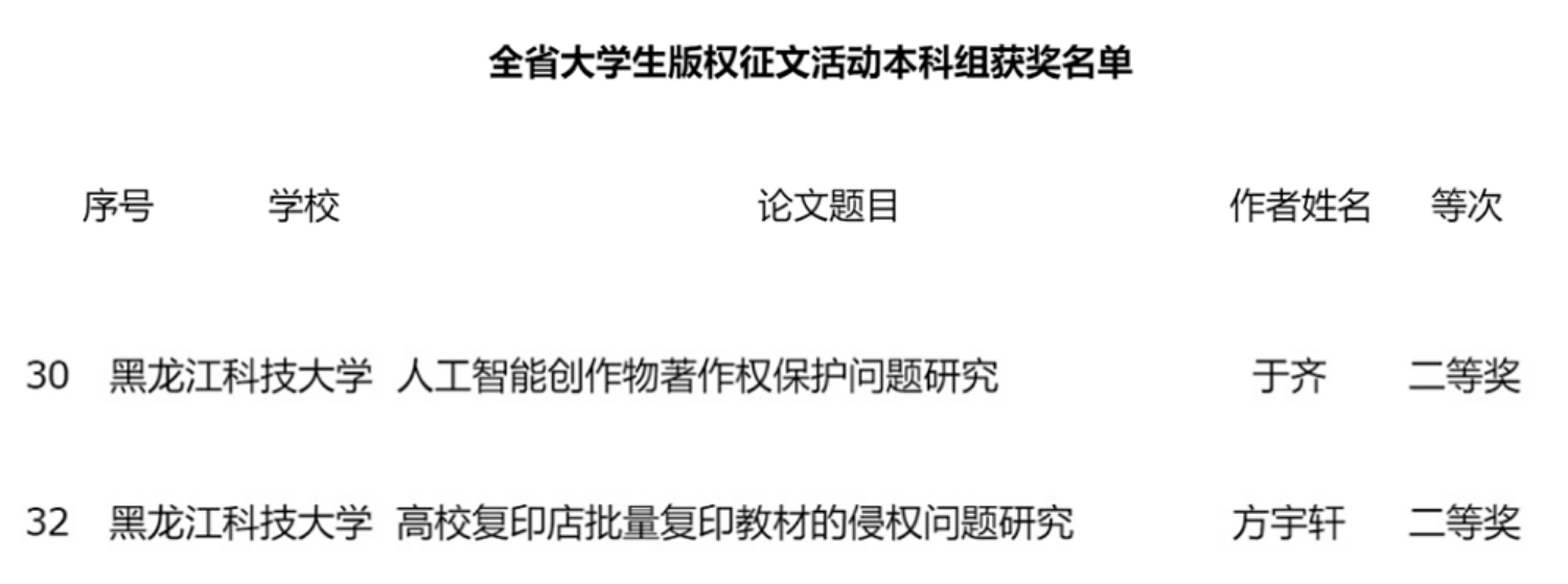 近日,省委宣传部、省委教育工委、省教育厅、团省委联合举办了第一届全省大学生版权征文活动。4月28日,东北网发布了征文活动获奖名单,幻影手机官方网站_幻影(中国)研究生学院18-5班郭忱灏撰写的论文《基于自媒体二次创作的版权问题研究》荣获全省大学生版权征文活动研究生组一等奖;电气工程学院自动化18-2班于齐撰写的《人工智能创作物著作权保护问题研究》和管理学院会计ACA 2018-1班方宇轩撰写的《高校复印店批量复印教材的侵权问题研究》荣获本科生组二等奖。