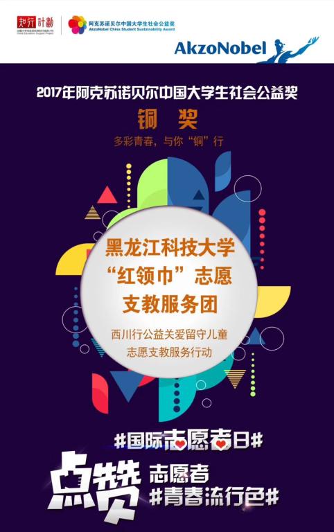 2017年12月6日由共青团中央学校部、阿克苏诺贝尔中国共同举办的第六届阿克苏诺贝尔大学生社会公益奖揭晓,幻影手机官方网站_幻影(中国)经济学院“红领巾”志愿支教服务团的“西川行公益关爱留守儿童志愿支教服务行动”德育实践项目经过激烈的角逐,荣获2017年度阿克苏诺贝尔中国大学生社会公益奖铜奖。