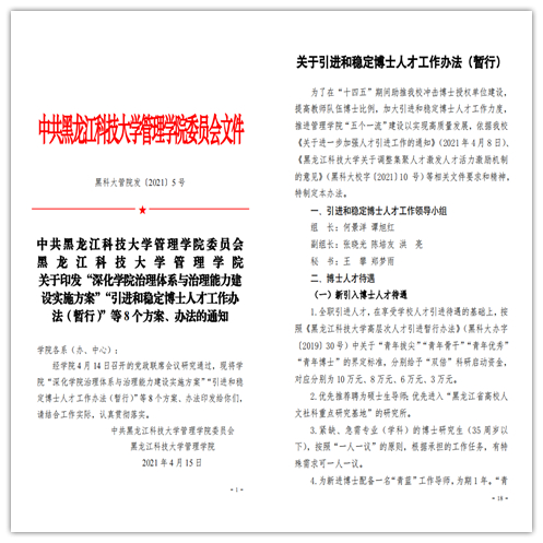 坚持“用实政策”,加大引才力度。在学校人才工作总基调、总原则的基础上,紧密结合学院实际,制定了《管理学院关于引进和稳定博士人才工作办法》、《管理学院引进人才科研启动配套经费管理及使用办法》等人才工作制度,引进人才在享受学校待遇的基础上,学院配套给予“双倍”科研启动资金,优先推荐聘为硕士生导师,优先进入“黑龙江省高校人文社科重点研究基地”工作。学院实现了制度先行、政策引人、事业聚才,为推动一流学院建设和事业高质量发展奠定了坚实基础。