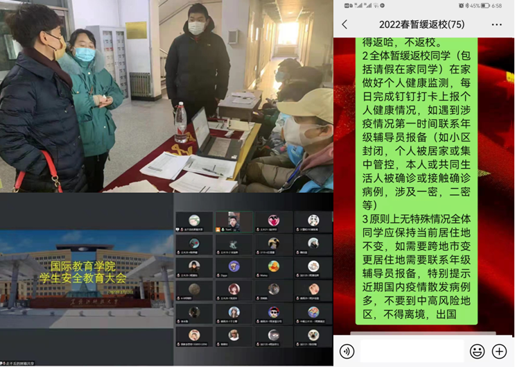 为严密精准做好疫情防控各项工作,密织校园安全网络,国际教育学院深入贯彻落实学校关于疫情防控工作的各项部署,严格落实“日报告”“宿舍通风”、“体温晨午检”等制度,细致做好学生排查工作。通过详细统计学生返校十四天以来的行程轨迹,返校乘坐车次车厢、经停车站时长等,掌握请假学生动态等途径进一步提升排查速度和效率;通过辅导员每日深入学生宿舍同学生“面对面”、“心连心”的交流,坚持与隔离学生建立日沟通等途径,全面对学生进行关心关怀;通过召开安全教育大会讲解校园疫情防控的必要性和迫切性及如何切实地做好个人防护,促使学生充分认知校园疫情防控的重要性,提高学生自我防护意识,引导学生把疫情防控的各项要求落实、落细,切实保障了学生生命安全、身心健康和校园安全稳定。
