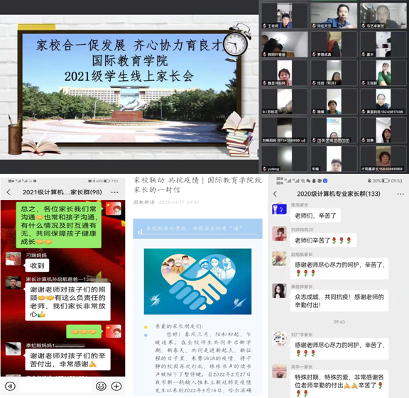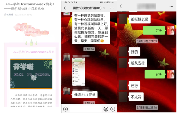 开学以来,学院全体师生按照防控要求进入战时状态,坚守校园防疫一线。学院始终坚持以生为本,为生尽责,秉承“学生在哪里,工作阵地在哪里”的工作理念,在校园紧急管控期间,学院党委书记齐秀强、党委副书记徐海英及学工办全体辅导员,“舍小家、顾大家”,坚守在学生身边与学生同吃同住,时刻关爱学院每一位学生。针对季节性因素对学生心理健康影响等问题,通过“国教新语”微信公众平台推出新学期心理小指南等文章并依托学院“小花儿”心理育人工作室陆续开展了“与阳光作伴,为心灵导航”心理委员及寝室心理联络员技能培训会、户外心理团体辅导活动、“病毒无情人有情之清晨一语”等系列活动,与学生“心连心”,画好战疫“同心圆”。对于隔离的学生辅导员更是时刻嘘寒问暖及安全教育,随时了解他们的学习和生活情况,做到每日有交流、时时有跟踪,并为隔离学生送去关心慰问。通过召开“家校合力 同心共育”线上家长会、通过学院新媒体平台向全体家长推送《家校抗疫攻坚战,共筑安全防疫“墙”》致家长的一封信,进一步推进疫情防控常态化的各项管理要求,帮助学生明确努力方向,促进学校教育和家庭教育协同发展。