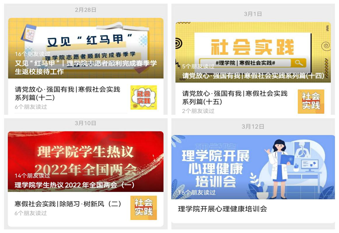 “江畔理学之音”点亮学子心声。学院充分利用网络阵地,依托“江畔理学之音”公众号,围绕疫情防控、全国两会、党史学习、校园文化活动等方面工作,推送文章20余篇。网络意见箱畅通诉求渠道。学院设置了专门的网络邮箱,方便学生反馈各项诉求,同时将学校下发的各类诉求渠道向学生公开,学工办派专人定期对意见和诉求进行收集、整理,并及时反馈给学生。网络舆情监控初见效。通过设立班级信息员,对学生微信朋友圈、微博、黑科校际等网络自媒体进行关注。