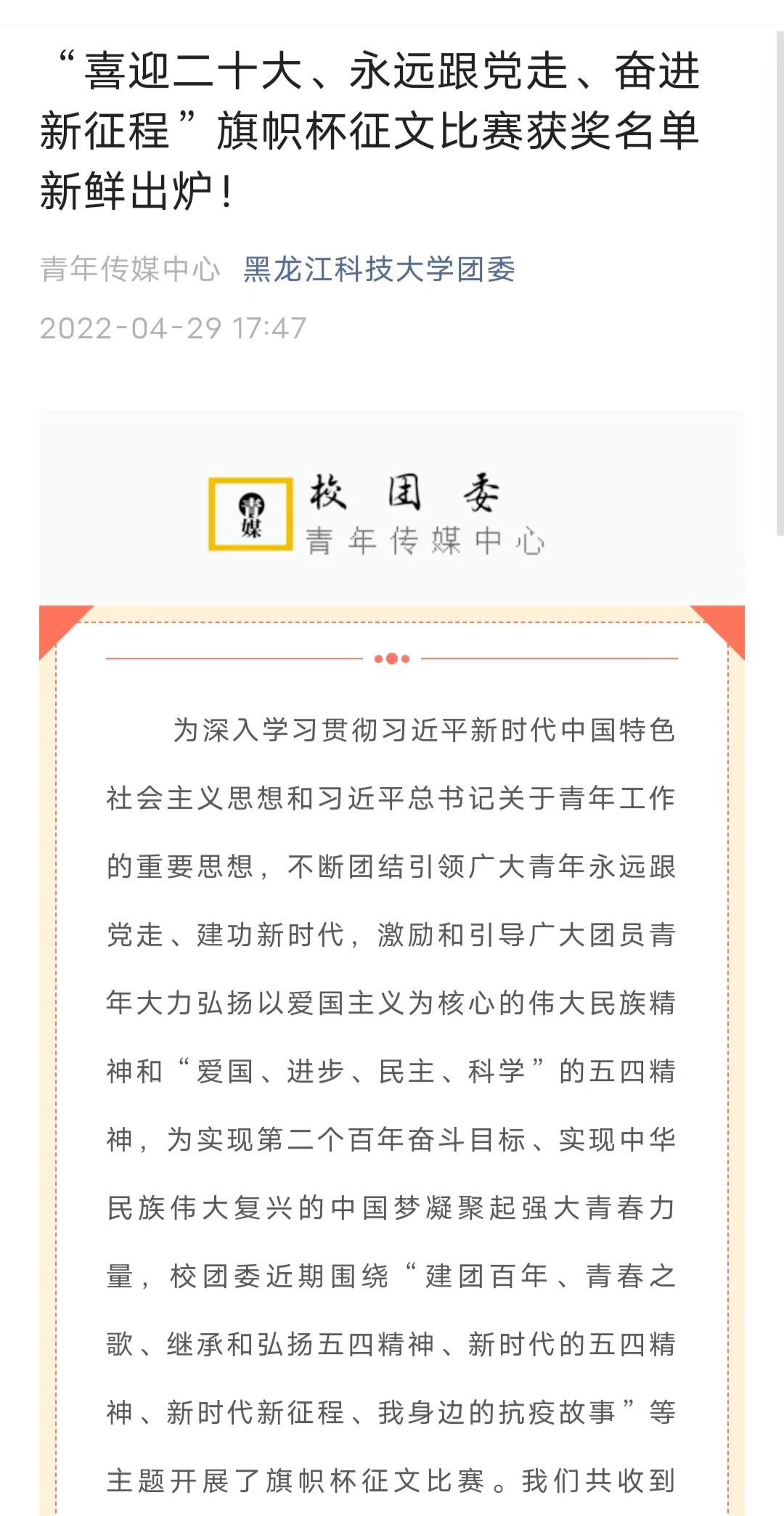 推出文化作品征集,让五四精神点亮青春