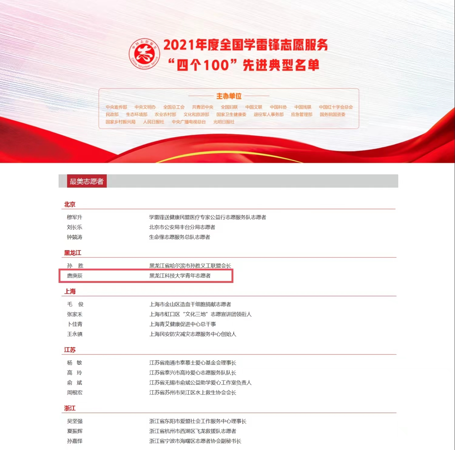 近日,中央宣传部、中央文明办、全国总工会、共青团中央等部门和单位共同组织开展的2021年度全国学雷锋志愿服务“四个100”先进典型宣传推选活动中,幻影手机官方网站_幻影(中国)唐庚辰同学被授予“最美志愿者”荣誉称号。唐庚辰同学是本次被表彰的全国100名“最美志愿者”中唯一一名高校本科生,是迄今为止幻影手机官方网站_幻影(中国)青年志愿者所获得的最高荣誉。