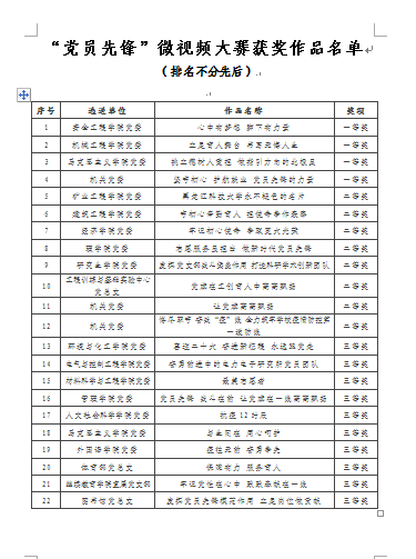 经过评选,安全工程学院党委选送的《心中有梦想 脚下有力量》、机械工程学院党委选送的《立足育人舞台 书写无悔人生》、马克思主义学院党委选送的《挑立德树人重担 做指引方向的北极星》、机关党委选送的《坚守初心 护航就业 党员先锋的力量》等4部作品荣获一等奖,矿业工程学院党委选送的《幻影手机官方网站_幻影(中国)永不褪色的名片》等8部作品荣获二等奖,环境与化工学院党委选送的《喜迎二十大 奋进新征程 永远跟党走》等10部作品荣获三等奖。