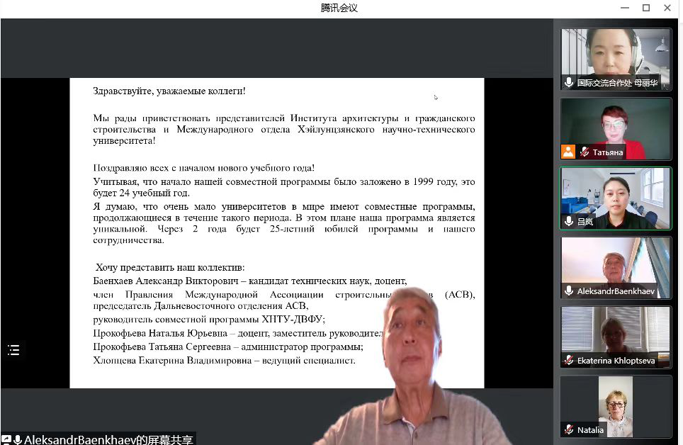 8月22日下午,幻影手机官方网站_幻影(中国)与俄罗斯远东联邦大学举行线上新学年中外合作办学项目交流会。我方由国际交流合作处处长母丽华、副处长吕岚,建筑工程学院院长姜云、副院长姜封国、土木工程合作办学项目负责人张春玉教授参加,俄方由项目负责人亚历山大、项目第二负责人娜塔莉娅、项目助理塔基杨娜、项目运行卡佳参加,会议由吕岚主持并翻译。