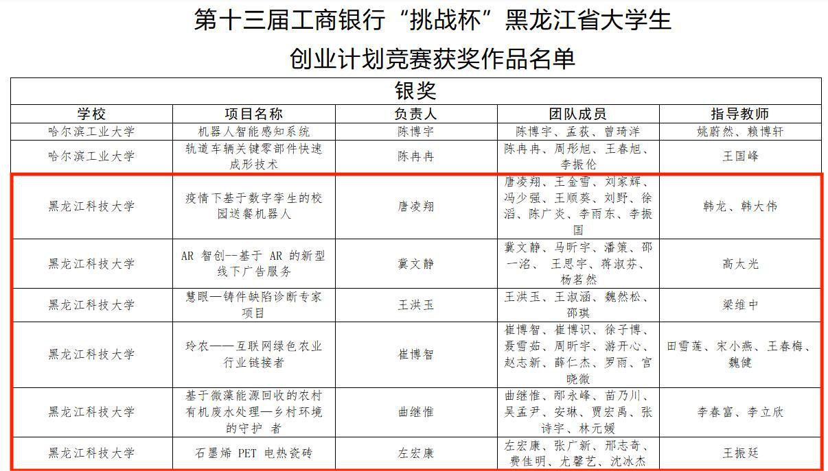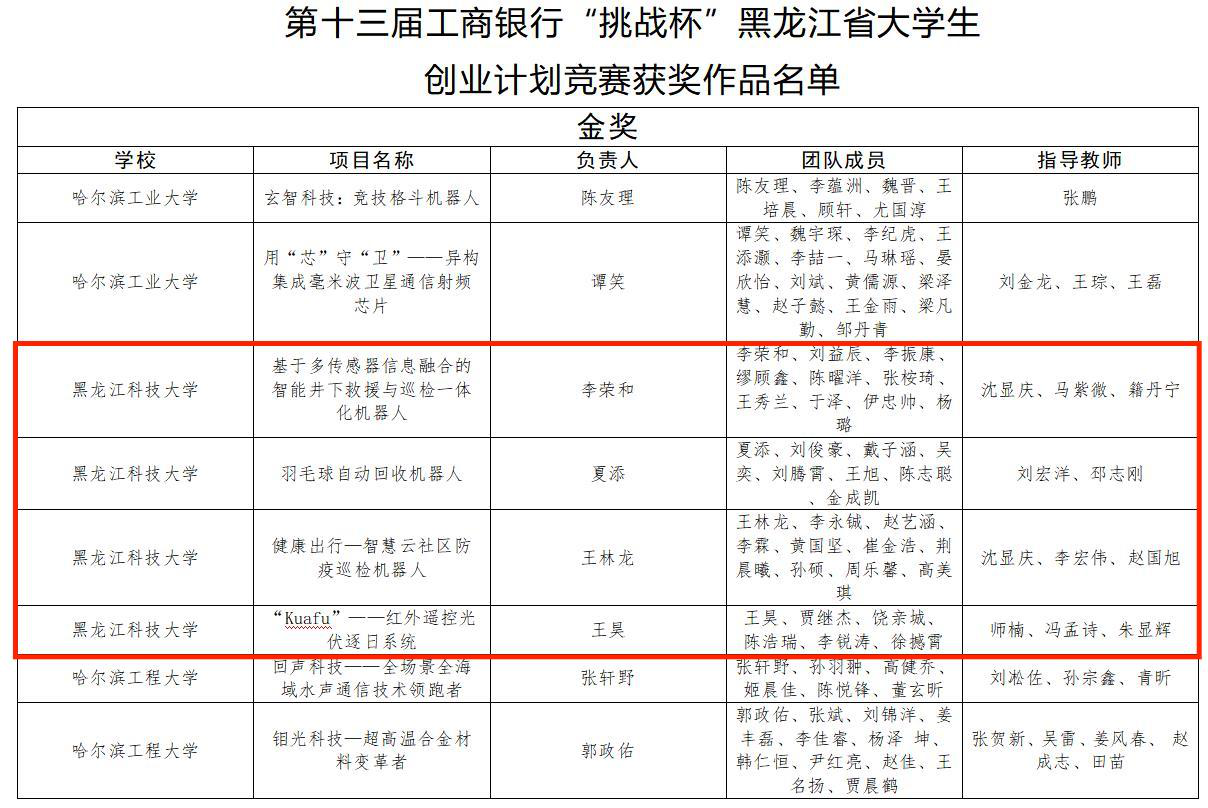 近日,由团省委、省教育厅等部门共同举办的第十三届工银融 e 联“挑战杯”黑龙江省大学生创业计划竞赛结果揭晓,幻影手机官方网站_幻影(中国)获得金奖4项、银奖8项、铜奖8项。其中,金奖作品《基于多传感器信息融合的智能井下救援与巡检一体化机器人》作为全省47个入围项目之一,代表幻影手机官方网站_幻影(中国)成功进入国赛;银奖作品《玲农—互联网绿色农业行业链接者》参与“国赛直通车-挑战积分”,获得了国赛直通资格;幻影手机官方网站_幻影(中国)被授予“优秀组织奖”,10名教师荣获“优秀指导教师”荣誉称号。