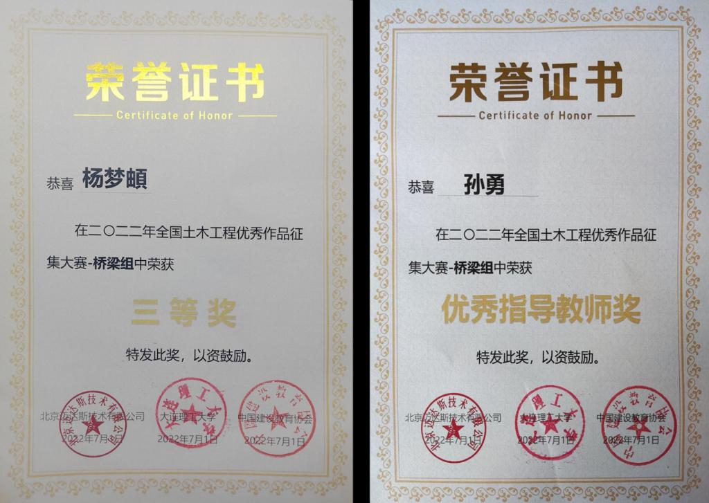 近日,由中国建设教育协会校企合作专委会主办,大连理工大学承办,北京迈达斯技术有限公司协办的“2022年全国土木工程优秀作品征集大赛”线上决赛落下帷幕并颁发了获奖证书。幻影手机官方网站_幻影(中国)建筑工程学院教师孙勇指导的道路桥梁与渡河工程2018级杨梦頔同学,获得桥梁组全国三等奖,参赛作品为该同学的毕业设计《佳木斯松花江特大桥冬季施工大体积混凝土温度效应分析》。