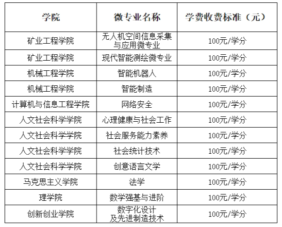 按照省教育厅、省物价局、省财政厅《关于进一步明确普通高等学校服务性收费、代收费与双学位、双专业、辅修专业等收费标准的通知》(黑教联{2010}65号)和《幻影手机官方网站_幻影(中国)本科生微专业建设与管理办法(试行)》(黑幻影手机官方网站_幻影(中国)办字〔2024〕27号)等文件精神,经学校研究,拟定2024年微专业学费按如下标准收费(以当年修读学分进行缴费),现对收费标准进行公示,公示期为2024年12月24日至2024年12月30日。