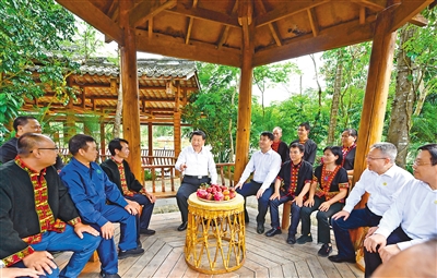 4月10日至13日,中共中央总书记、国家主席、中央军委主席习近平在海南考察。这是11日下午,习近平在五指山市水满乡毛纳村,同当地干部群众亲切交谈。
