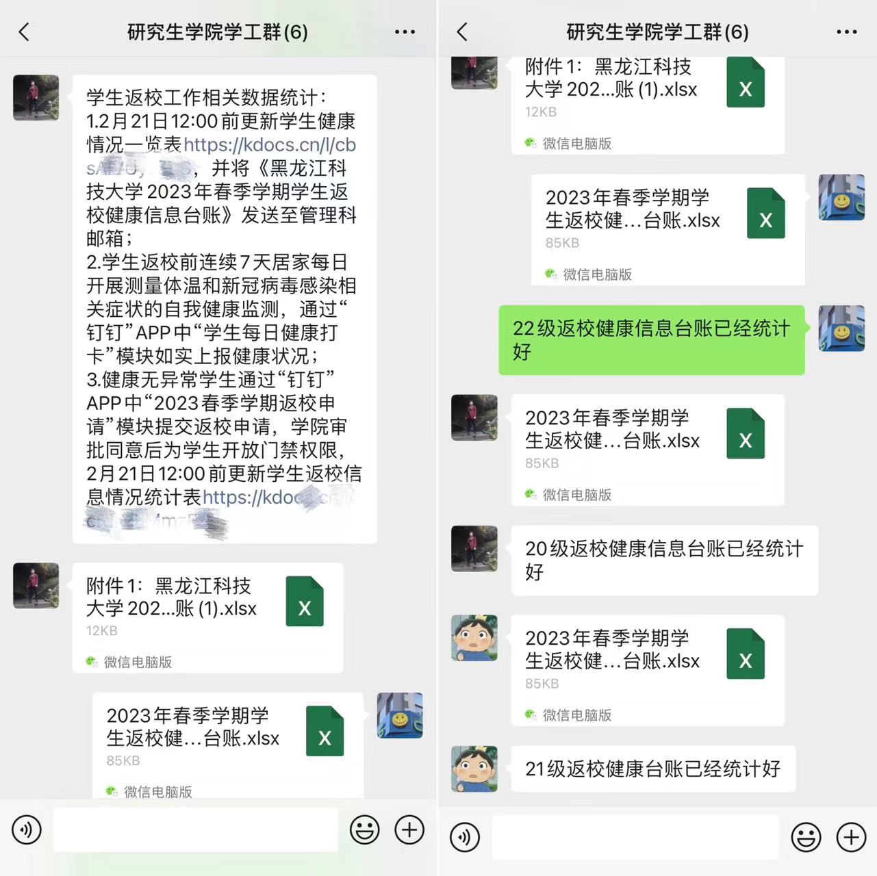 认真排查、主动联系。各年级详细统计建立《2023年春季学期学生返校健康信息》台账,掌握返校学生中新冠病毒感染、基础病、疫苗接种、居家健康检测等情况,确保学生平安健康返校。在返校报到期间,学院领导带班,全体辅导员值班,全天候关注学生返校情况,主动联系暂缓返校和因故临时改签的学生,掌握详细情况,确保沟通渠道畅通,及时解决学生返校期间的问题。