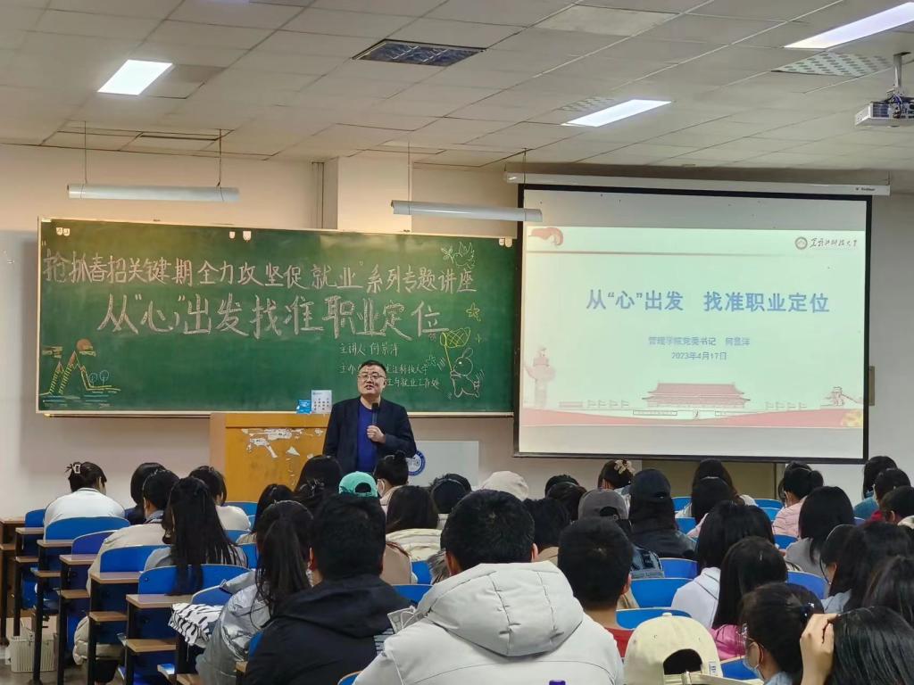 讲心语,找准心灵定位。为精准推进学院毕业生就业帮扶工作,积极营造全员参与、支持就业的浓厚氛围,4月17日,学院开展2023届毕业生“从‘心’出发,找准职业定位”就业心理帮扶专题讲座。学院党委书记何景洋与考研失利、就业困难毕业生群体面对面交流,听取了同学们对考研经历的总结以及对未来发展的规划,针对同学们当下的迷茫和困惑给予了建议和指导,勉励同学们树立正确的就业观念,积极主动地在社会实践中认识自己、明确方向。